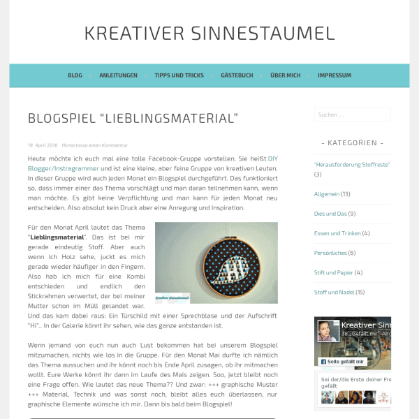kreativer sinnestaumel 23.04.2016 von kreativersinnestaumel Kategorie: Kreativblogs Stichwörter: Backen, Basteln, DIY, färben, Holz, kochen, kreativ, Nähen, Papier, Stoffe, Upcycling https://kreativersinnestaumel.wordpress.com/ merken